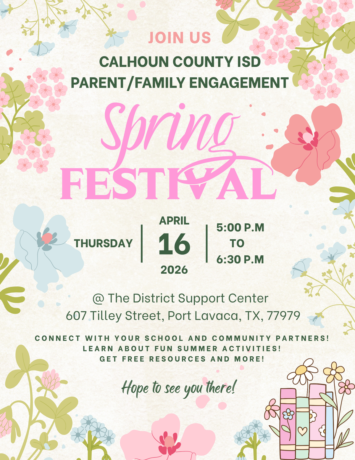 Calhoun County ISD is hosting a family engagement spring festival on Thursday, April 16 from 5 to 6:30 p.m. at the District Support Center, 607 Tilley Street in Port Lavaca (former Travis Science B...
