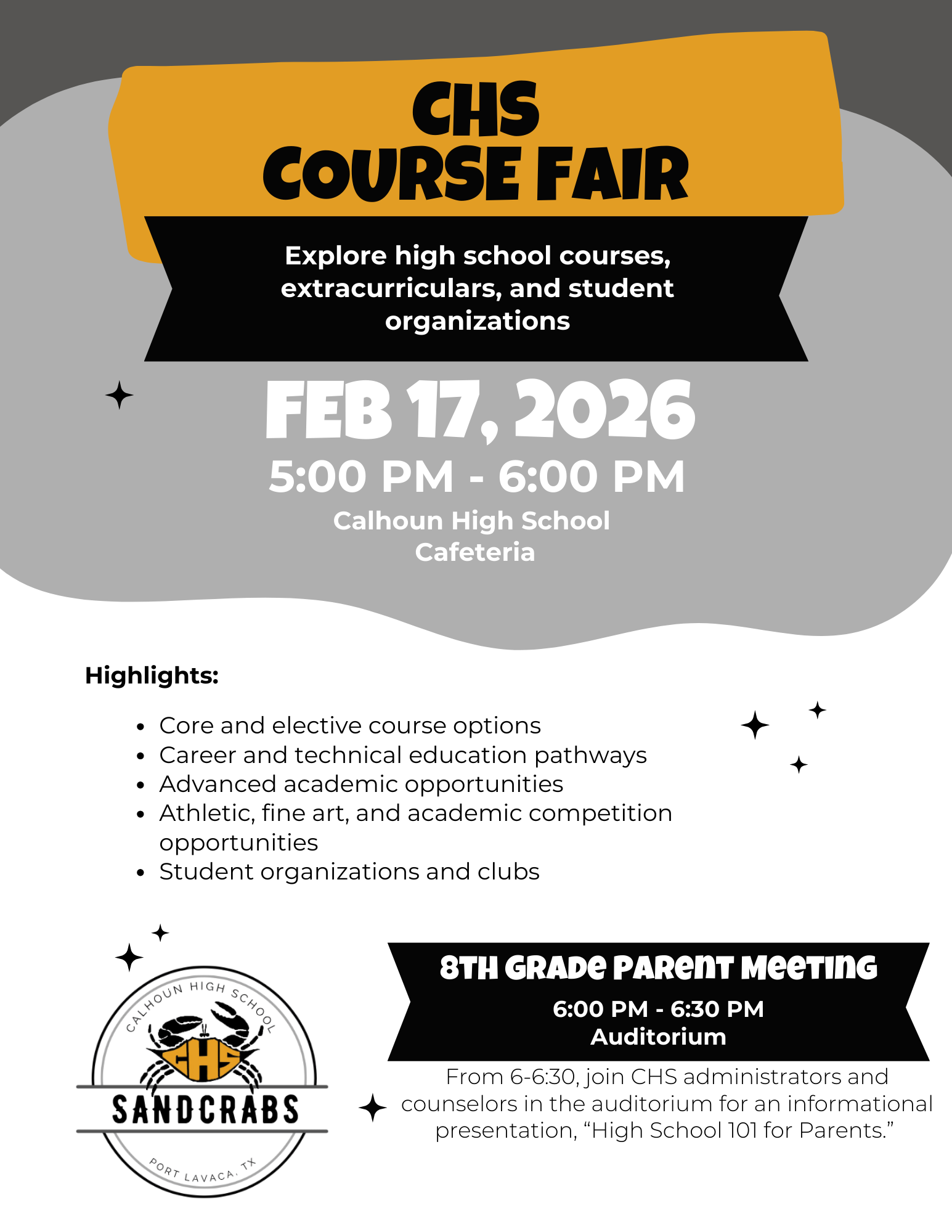 Calhoun High School is home to over 1,200 students from every corner of our county — including Port Lavaca, Port O’Connor, Seadrift, Point Comfort, Olivia, Port Alto, and beyond. No matter where you come from, you’ll find a place to belong here at CHS.