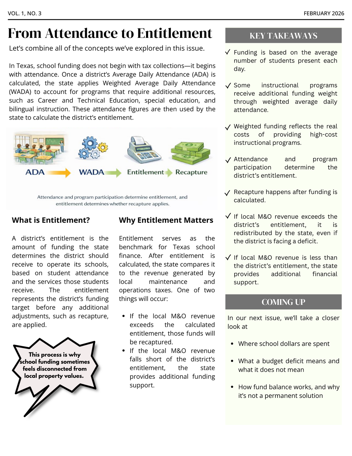 In this third issue of our school finance series, we first delve into the cost of recapture. Also, we examine how attendance and weighted funding impact the district’s entitlement, which ultimately decides whether recapture is applicable.